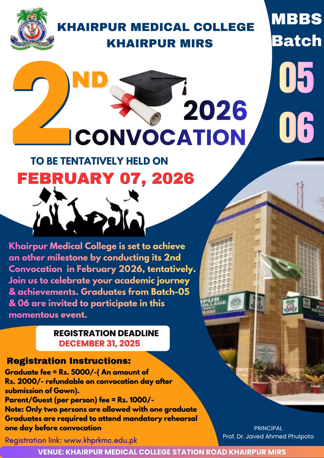 Khairpur Medical College, Khairpur Mirs was established and inaugurated by Honorable Chief Minister of Sindh, Syed Qaim Ali Shah on 29th December 2012 in Elementary college Khairpur Mirs. Initially with name of LUMHS Khairpur Medical College, Khairpur Mirs as a part of Liaquat University of Medical & Health Sciences, Jamshoro. Later on, the name of college was changed to Khairpur Medical College, Khairpur Mirs as Project of Government of Sindh. Presently, there are 12 public sector Medical Colleges in Sindh including KMC Khairpur. The College was recognized by Pakistan Medical & Dental Council, Islamabad for 100 MBBS seats in 2015 and re recognized & registered by Pakistan Medical Commission /HEC Islamabad in january 2020 After recognition, first batch of 100 students was admitted for session 2014-15 who have graduated in March 2020. The PM&DC curriculum is adopted and modular system of examination is started from 2022 according to syllabus of PUMHS-Nawab Shah(SBA). There is system of counseling and continuous internal assessment to help students and teachers abreast with learning and simultaneous self-evaluation.